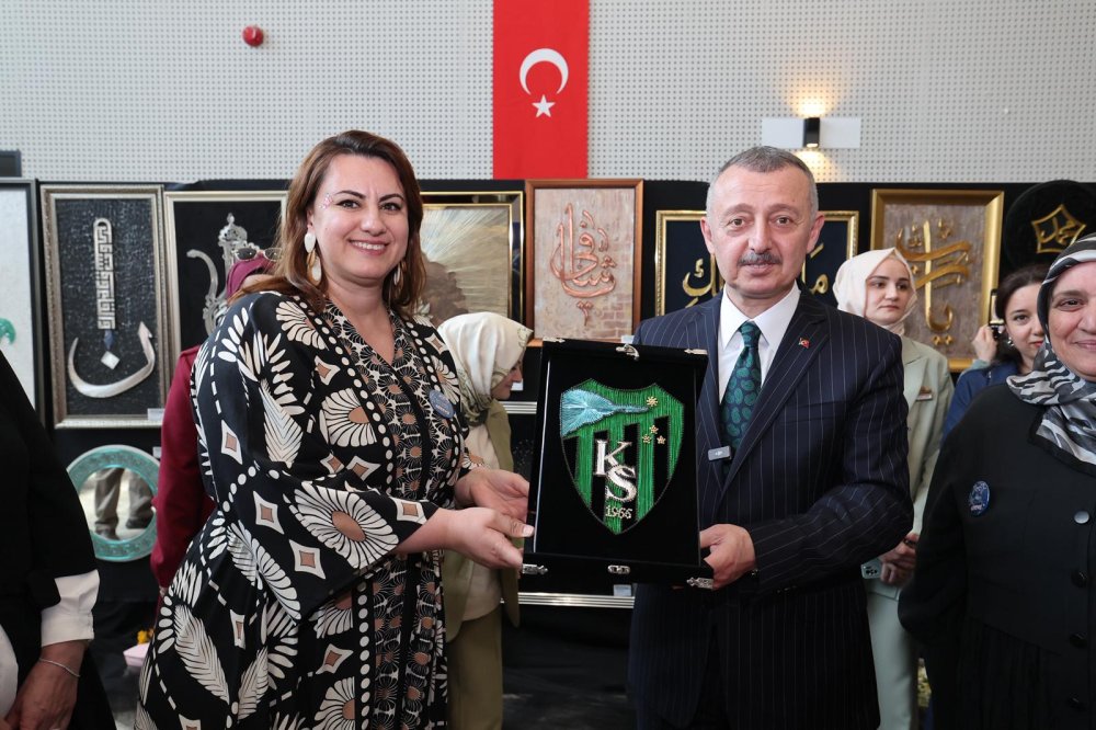 Konuşmaların ardından Başkan Büyükakın’a hüsn-i hat tablosu hediye edildi. Başkan Büyükakın da gelenek olduğu üzere, söz konusu tabloyu en yakın zamanda evlenecek bir kursiyere takdim etti. Daha sonra, geleneksel KO-MEK bohçasını nişanlı kursiyere hediye etti. Açılış kurdelesini kursiyerler ve çocuklarla birlikte kesen protokol üyeleri, sergi alanını gezerek el emeği göz nuru ürünleri inceledi. Ürünler hakkında bilgi alan Başkan Büyükakın, kursiyerleri kutladı.